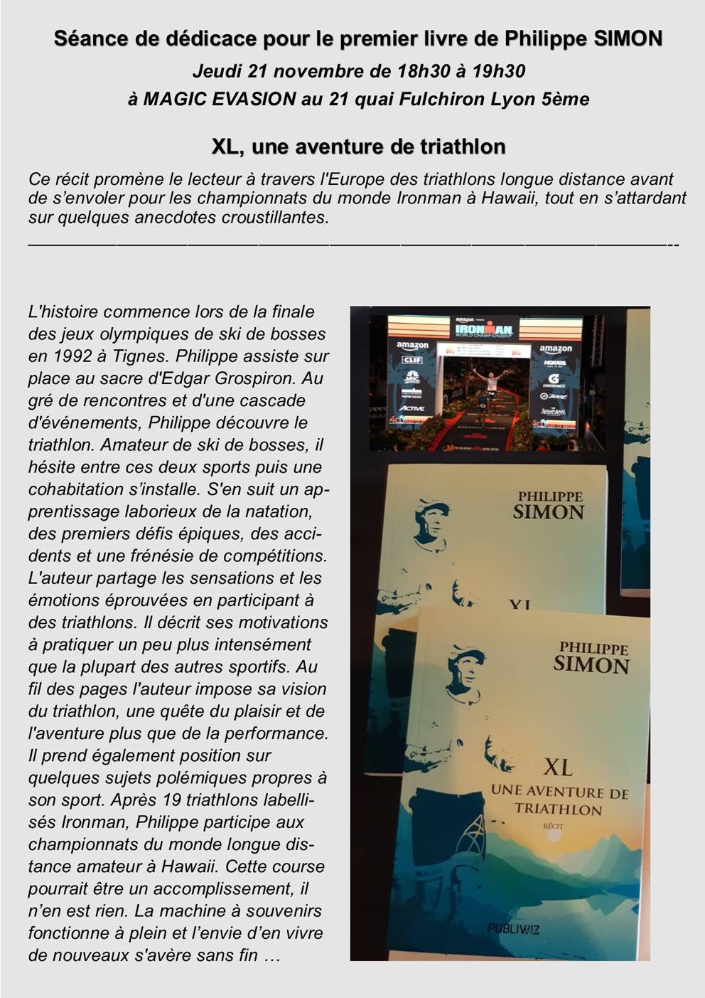 Un ami de très longue date qui cumule une certaine appétence pour l'écriture et le goût de l'effort (plusieurs Ironman par an) vient à Lyon pour dédicacer son livre ("XL, une aventure de triathlon") le jeudi 21 novembre. Ce sera l'occasion d'échanger avec lui sur son expérience dans les triathlons Longue Distance (il pourra ainsi démystifier cette distance pour les nouveaux triathlètes).