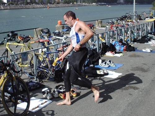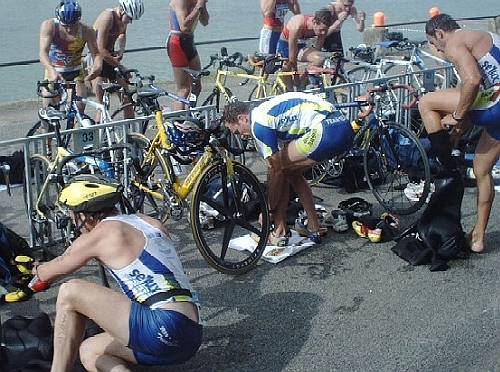 Claudio, sorti de l'eau devant, aura le temps de se pomponner avant le départ vélo (comme un autre célèbre Magic Swimmer) ! |