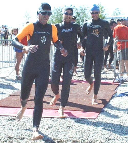 Quelques minutes plus tard, c'est le départ. Sylvain se croit à la Saintélyon et part devant... malheureusement, malgré une profondeur d'eau parfois limite, il va lui falloir nager 750 m. |